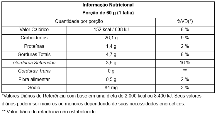 Recheio de brigadeiro (glicose, açúcar, leite condensado, leite em pó integral, amido modificado, fibra de trigo, cacau em pó, conservador sorbato de potássio, acidulante ácido lático e aromatizante idêntico ao natural), pão de ló sabor chocolate (ovo, açúcar, farinha de trigo enriquecida com ferro e ácido fólico, amido de milho, cacau em pó, amido modificado, emulsificantes ésteres de ácidos graxos com poliglicerol e mono ediglicerídeos de ácidos graxos, fermentos químicos bicarbonato de sódio, pirofosfato ácido de cálcio e fosfato monocálcico, conservadores propionato de cálcio e ácido sórbico, corante caramelo iv, aroma artificial de baunilha e espessante goma xantana), calda sabor baunilha, creme vegetal tipo chantilly sabor chocolate, confeito granulado sabor chocolate, e cereja marrasquino com cabo. Contém glúten.