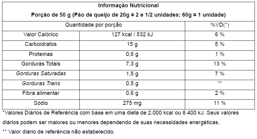 O pão de queijo congelado Montes Claros nunca deve ser recongelado. Não pode ser feito no micro-ondas. Podem ocorrer variações no tempo de preparo entre fornos.