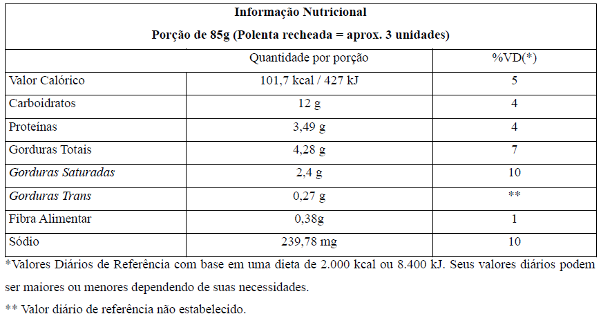 Água, farinha de milho enriquecida com ferro e ácido fólico, mussarela, requeijão, condimento sabor galinha (sal, amido, açúcar, realçadores glutamato monossódico e inosinato de sódio, aipo, alho, salsa, pimenta do reino, aromatizante, extrato de levedura, proteínas, vegetais, corante cúrcuma, corante caramelo, especiarias e vegetais desidratados), gordura vegetal hidrogenada, sal, alho e farinha de rosca.