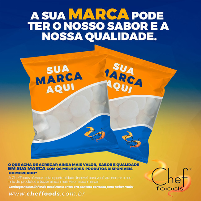 Aqui na Chef Foods, nós oferecemos o serviço de White label ou Marca própria. Ou seja, nós desenvolvemos sua própria marca de Pão de Queijo. A Chef Foods faz todo o processo de desenvolvimento de receitas, desenvolvemos a embalagem, produzimos o pão de queijo, embalamos e enviamos para você! Assim fica muito simples de ter o pão de queijo congelado com sua própria marca.
