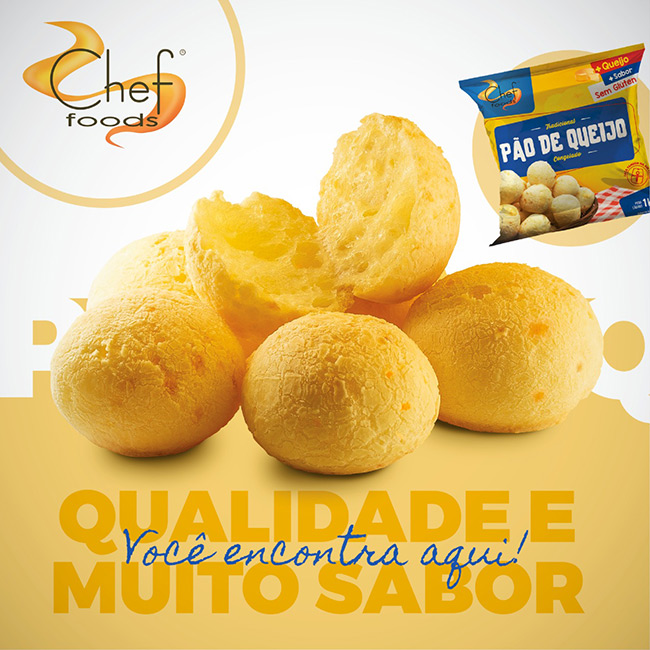 Nosso principal produto é o Pão de Queijo Congelado. Nossa receita foi desenvolvida pelo fundador da Chef Foods, Alexandre Dantas, que possui mais de 30 anos de experiência com panificação e desenvolvimento de receitas. O Pão de Queijo Chef Foods tem o sabor caseiro, segue exigentes processos de produção e possui qualidade única no mercado. Além disso, somos pioneiros na produção de Pão de Queijo congelado, pois temos mais de 18 anos de experiência e crescimento no setor.